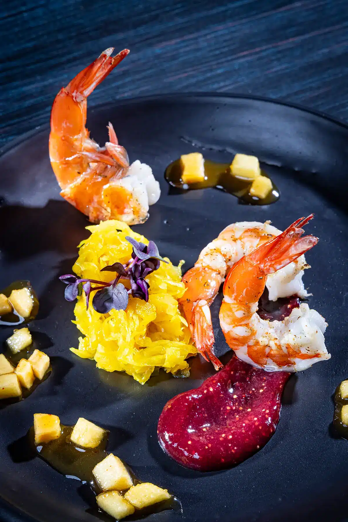 Gebirgsgarnelen – Süßkartoffelcreme mit knusprigem Knoblauch und Vogerlsalat