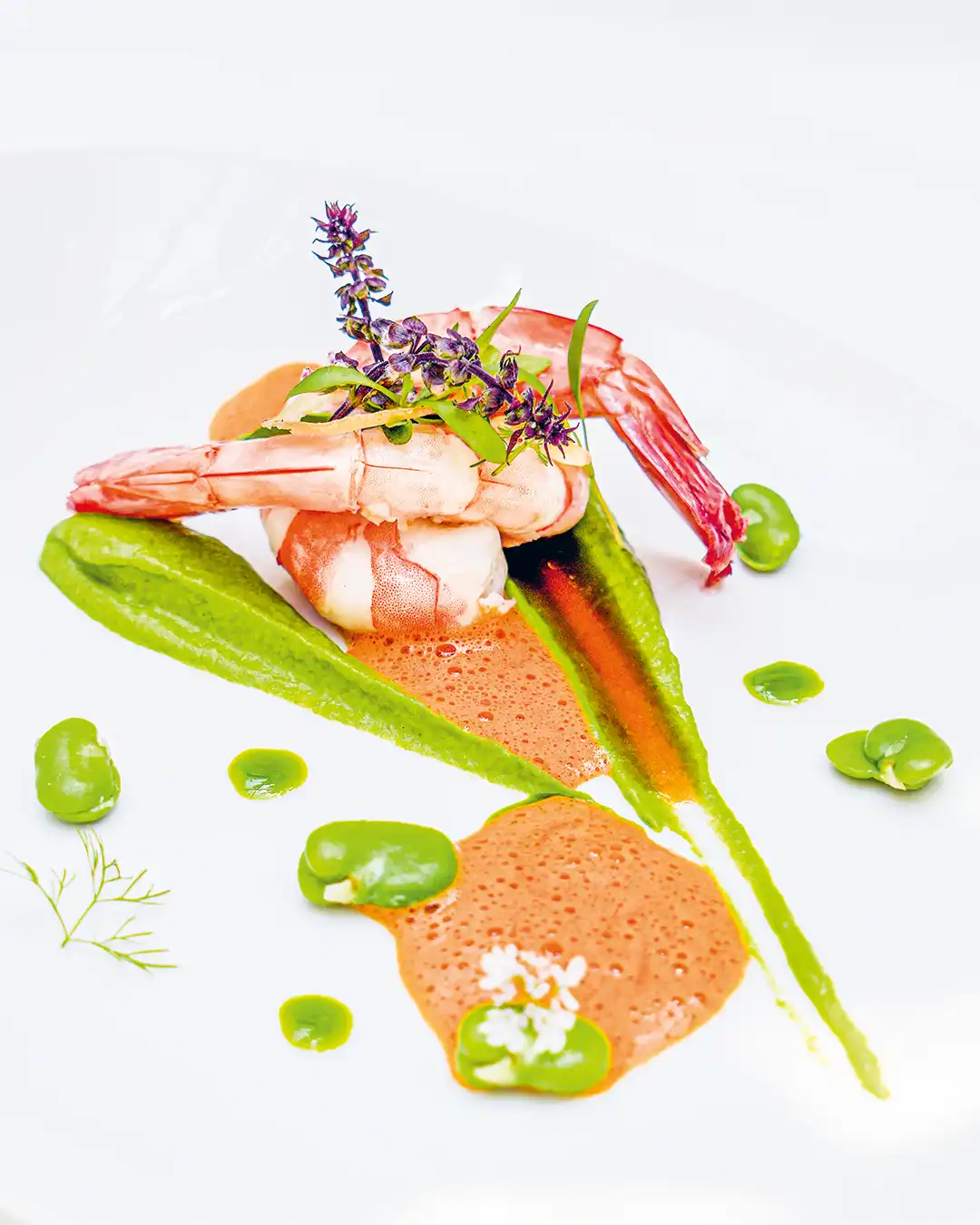 Gebirgsgarnelen – Süßkartoffelcreme mit knusprigem Knoblauch und Vogerlsalat