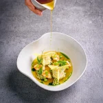 Daraufhin die Auberginen schneiden und frittieren, bis sie zart und goldbraun sind. Die Aubergine danach zu den restlichen Zutaten hinzufügen. Abschließend die Korianderblätter hinzufügen und alles im Hochgeschwindigkeitsmixer glatt pürieren. Zu guter Letzt durch ein feines Sieb abseihen.